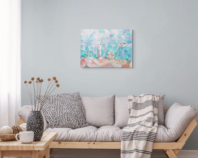 This artwork has a calming and meditative quality achieved through gentle colors and flowing shapes. It conveys a sense of lightness, almost weightlessness and movement, as if the objects are gently gliding. Noteworthy is the textured application of paint in dots and strokes, creating relief-like points. This technique gives the painting an additional dimension and produces interesting textures that vary with different lighting.
