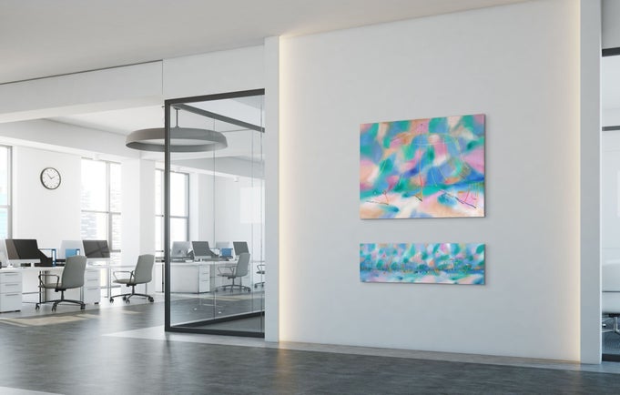 Both fragments show an abstract, dreamy scene in bright pastel colors and playful shapes in many shades of blue, turquoise, pink, and violet, creating a calming and lively atmosphere. The composition is horizontally oriented and shows a variety of surreal elements in harmonious balance. The seemingly floating structures and soft flowing colors let the viewer immerse into a fantasy world. The artistic use of colors and textures makes this diptych a fascinating example of modern abstract painting.