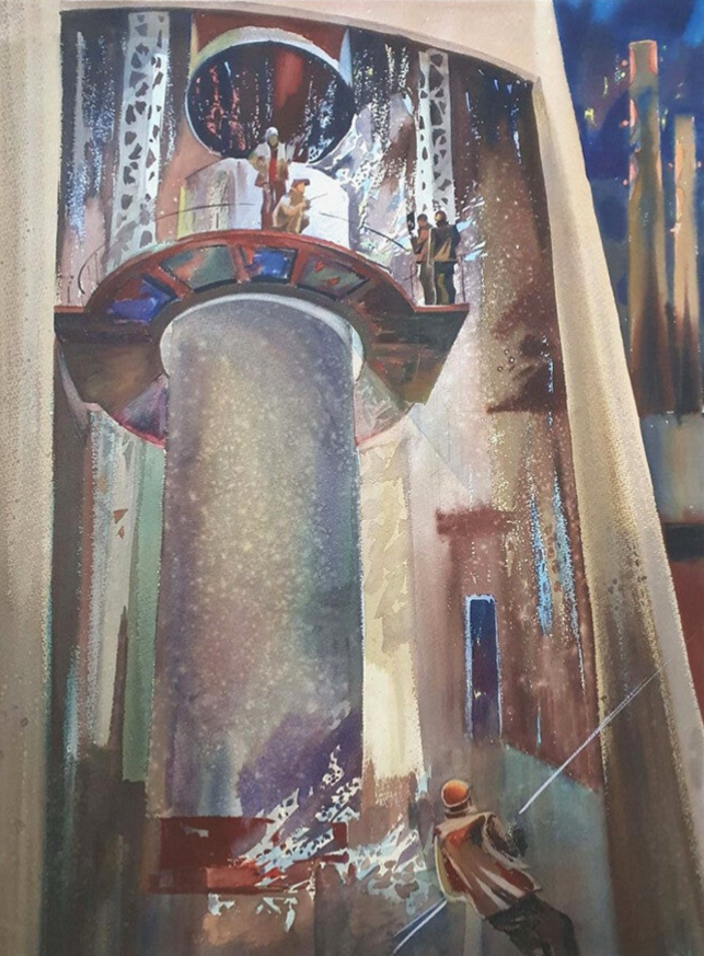 The watercolor "Depot" from 1974, painted together by the Russian artist couple Gretsky, is both artistically and historically important. It shows a scene from a Locomotive depot and captures the industrial atmosphere of that time impressively.