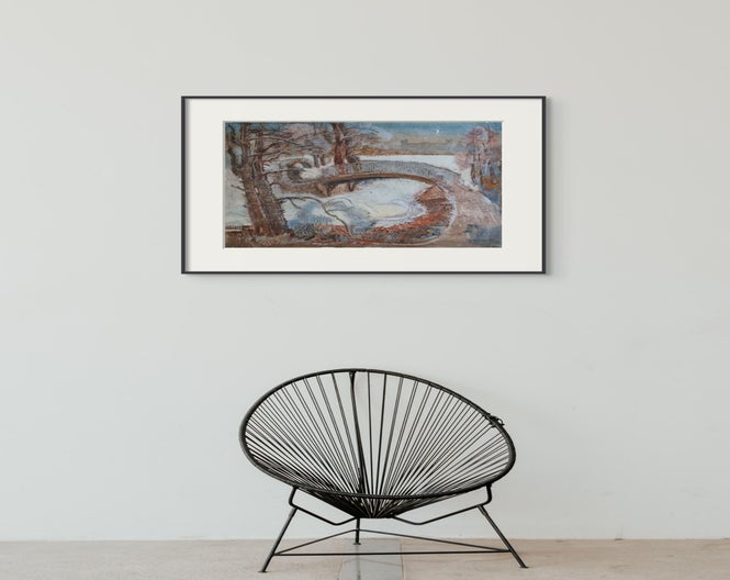 The watercolor "Gatchina Park" from 1993 by Jury and Irina Gretsky. The painting shows a snowy park landscape with a winding path leading to a bridge. In the sky, there is a half-moon, indicating twilight or early evening.